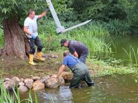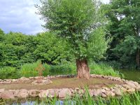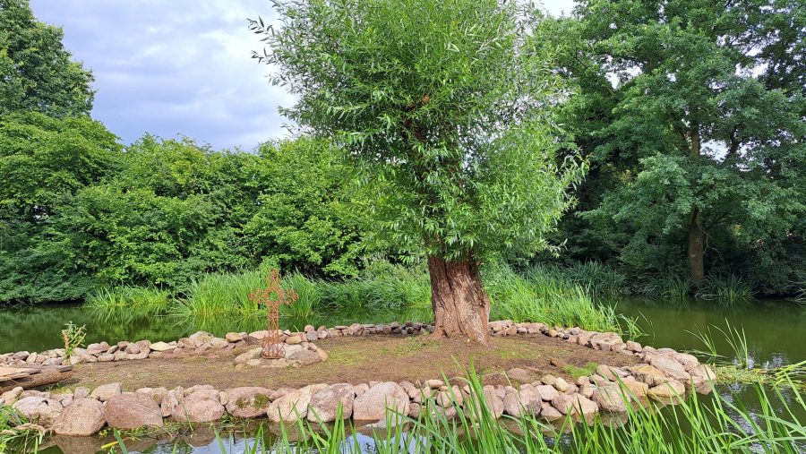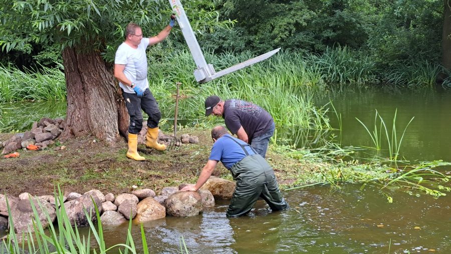 30.07.2025 TG – In den letzten Wochen ist an und in der Dränke viel passiert. Es wurden nach und nach Wasserlilien entfernt, so dass man die Insel wieder vom Wasser unterscheiden konnte. Feldsteine in sämtlichen Größen wurden gesammelt und herangekarrt. Und gestern ging es richtig zur Sachen. Am Vormittag wurde die Insel gesäubert und vom „Unkraut“ befreit. Der Weide auf der Insel wurde um ein paar Ästchen erleichtert, so dass sie wieder als Baum und nicht als Gebüsch erkennbar ist.