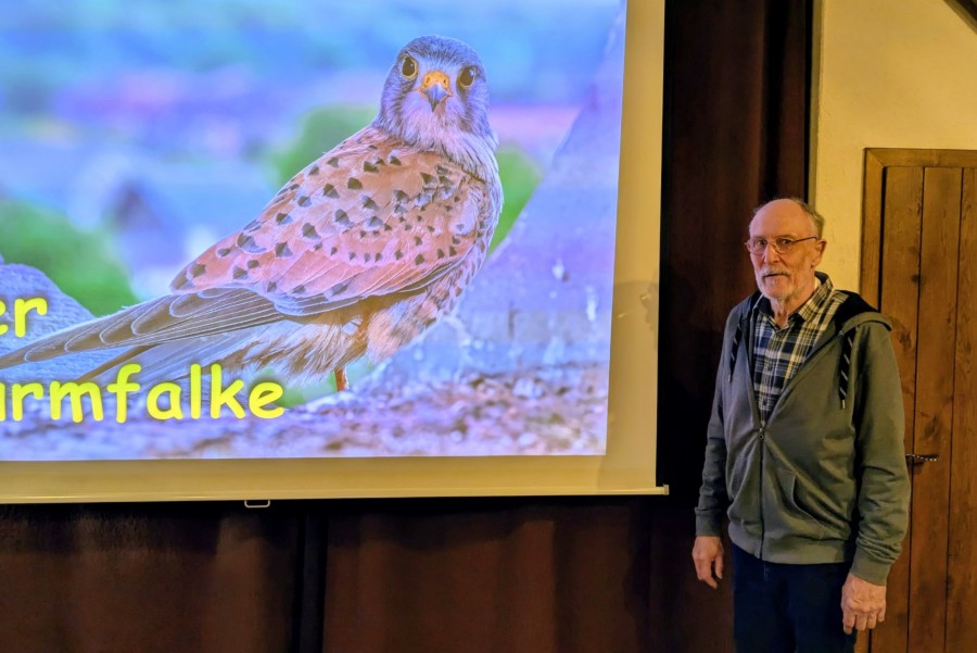 26.11.2025 UB – Vogelkundler Dr. Andreas Schüring war heute, am Sonntag den 26. Nov. 2025, auf Einladung von Johanna Terhalle beim Heimatverein Börger zu Gast. Und das nicht zum ersten Mal. Schon 2017 referierte er bei uns über den Uhu der hier auf dem Hümmling wieder heimisch ist und im Jahre 2010 gab es einen Bericht über den sehr seltenen Steinkauz. Der gelernte Mediziner und gewiefte Fotograf ist Experte der Vogelwelt. Er beschäftigt sich seit einigen Jahren mit der Erforschung des Lebens des Turmfalken und hat hier über Jahre fundiertes Wissen, Filmmaterial und Fotos gesammelt. Es waren kurzweilige interessante Stunden an diesem Sonntagnachmittag.