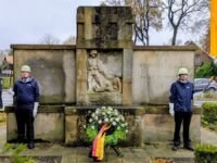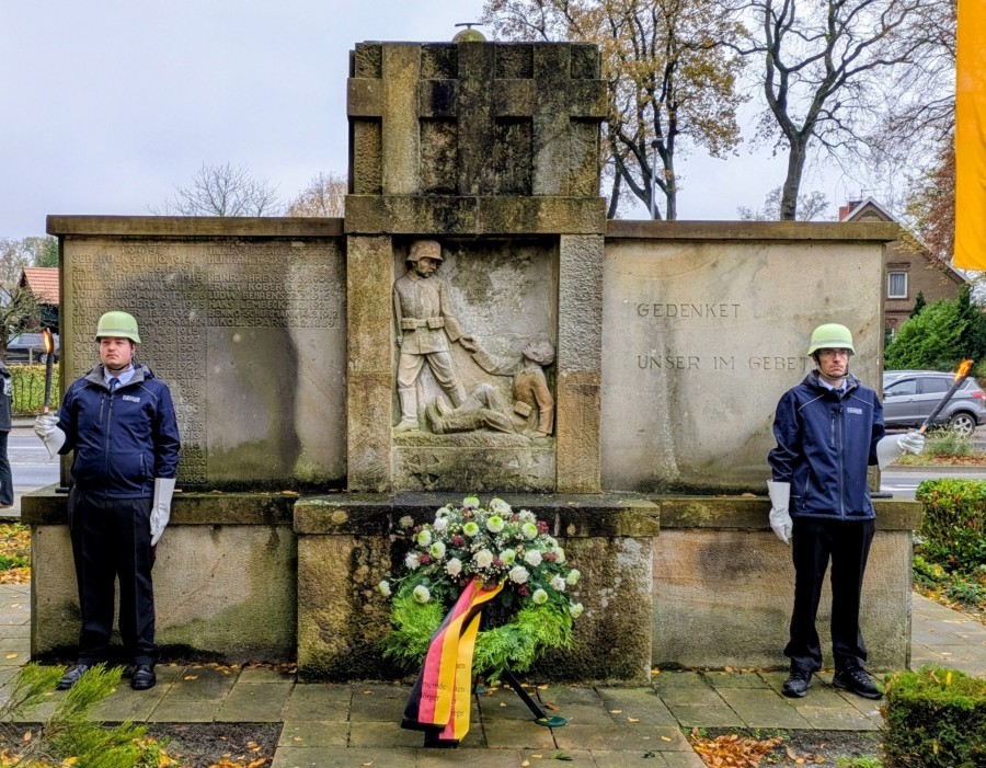 18.11.2025 UB – Auf Einladung des Bürgermeisters versammelten sich am Volkstrauertag, nach dem Hochamt, die Gemeinde vor der Kirche um der Opfer von Krieg, Gewalt und Terror zu gedenken. Bürgermeister Jürgen Ermes begrüßte die Fahnenabordnungen der Vereine, die Hümmlinger Musikanten, die Mitglieder der Kath. Kirche, des Kirchenchores und die etwa 150 anwesenden Gäste. Für die Gemeinde legten Jens Poltrock und Andreas Albers von der Feuerwehr einen Kranz am Ehrenmal nieder. Die Hümmlinger Musikanten spielten dabei das Stück „Ich hatte einen Kameraden“. Die Anwesenden sangen anschließend zusammen mit Alfons Kleine und Mitgliedern des Kirchenchores das „Börgermoorlied“ das als Moorsoldatenlied berühmt wurde.