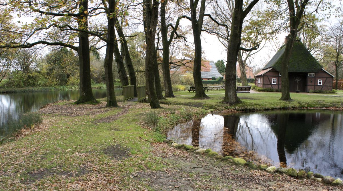 Up use Bäld (Foto UB) is dat Hus toau saein. Dit Sächsische Mitteldielen-Zweiständerhaus (Hümmlinger Oart) is over lange Tied dat Woahn- und Arbeitshus van den Borger Walkemüller, dej as Hürmann bi Müllers up´n Busk (Borgermühle) arbeitede, waehn. Dat Hus was an´t verfallen, as man dat Hus midde dej 1980er up Müllers-Hoff offbaude un hier up ´n Riegen as Heimathus waer upbaude, un so erhollen haff. Over dej groote Falldöre is noch toau läsen, wunner et baut is, un well dat Hus hörde. O-Gott-beware-dis-Haus-so-bleibt-das-unglück-daraus- Hermann Müller un Anna Müllers – Anno 1751 den 30. März.Kägenover van dat Walkemüller-Hus is dej Baustelle van use Teindschüre (Zehntscheune). Wenn dit tweide Gebäude mal fattig is, söll et use „Heimatkundliche Sammlung“, dat Heimatarchiv, Arbeitsrueme un Utstellung un ne „öffentliche Toilettenanlage“ upnähmen. Dann bünnt för´t erste dej Platzprobleme bi us vörbi un dej Gemeinde krigg ne Stäe, woar se sück doarstellen könnt.