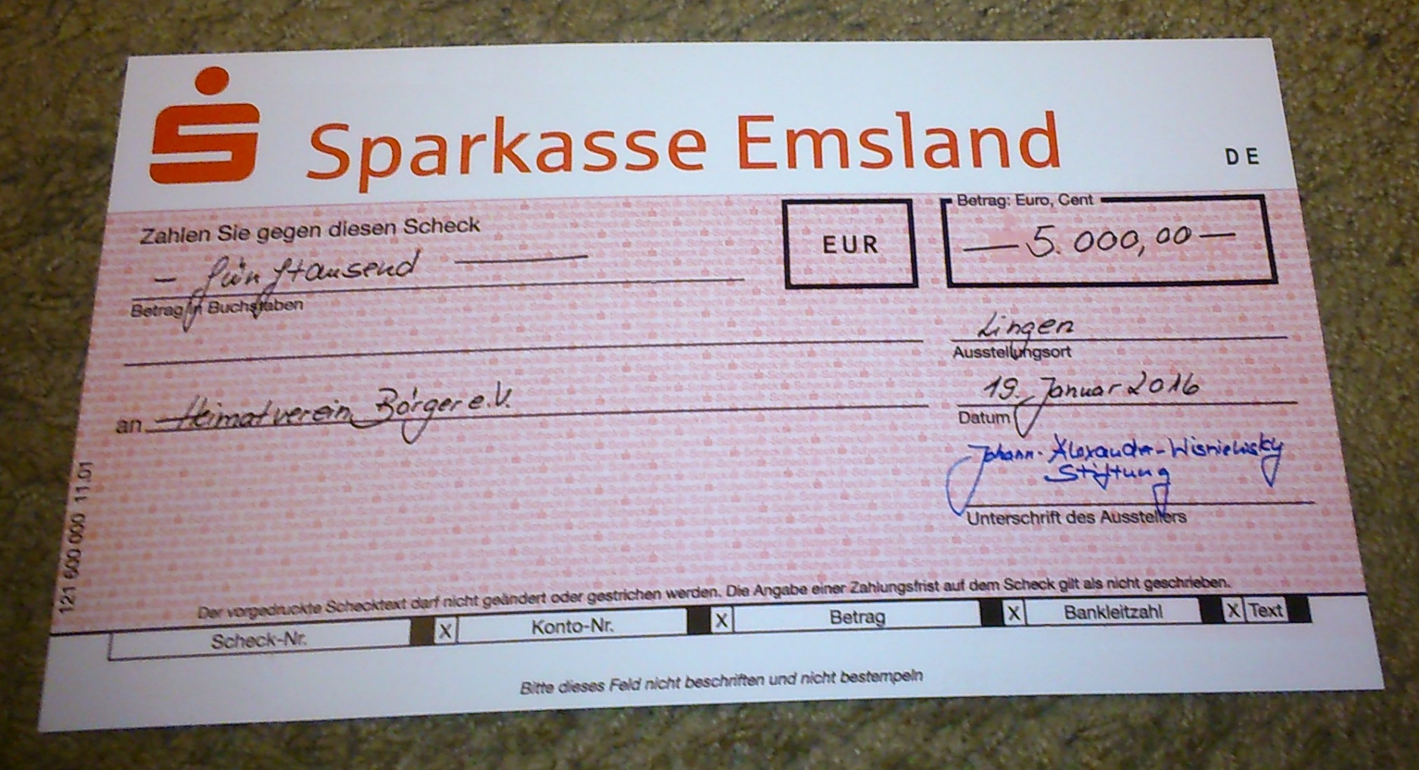 19.01.2016 UB – Bei einer Zusammenkunft im TPZ (Theaterpädagogisches Zentrum) im Lingener Professorenhaus wurden heute die Projekte vorgestellt, die die Johann-Alexander-Wisniewsky-Stiftung in diesem Jahr bedacht hat. Unter den Gruppen und Vereinen waren auch wir, der Heimatverein Börger e. V.. Wir erhielten für das Projekt „Mehrzweckgebäude – Zehntscheune“ auf Antrag aus 2015, 5.000 Euro zugesprochen. Hierfür bedanken wir uns bei dem Stiftungsvorstand mit Hermann Bröring, herzlich.