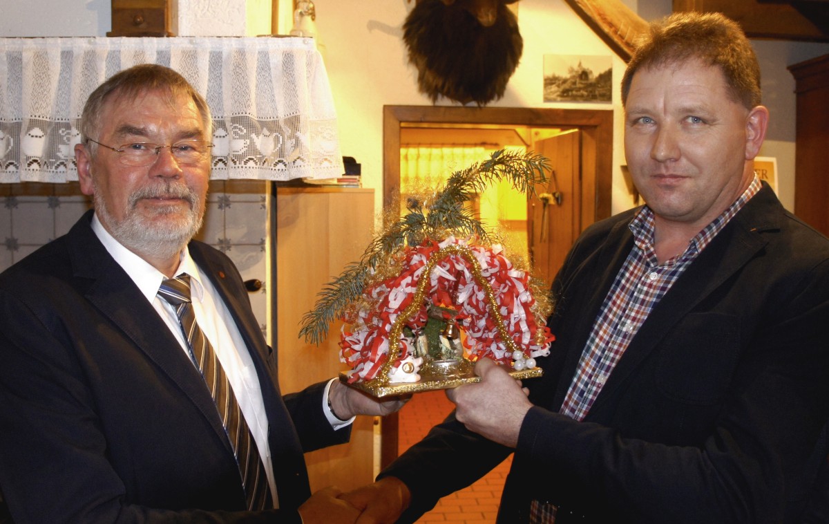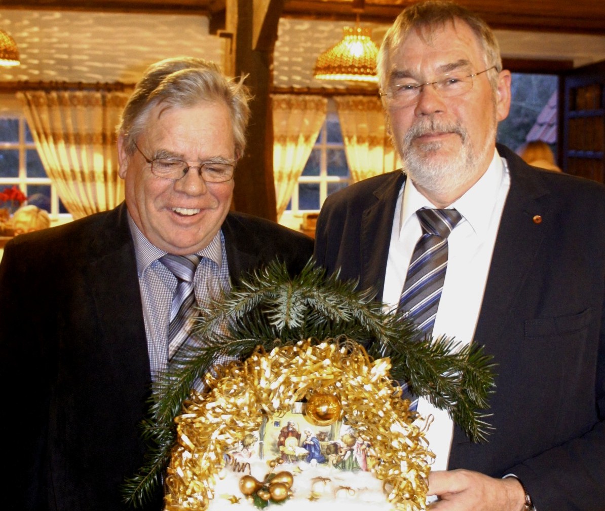 Bürgermeister Hermann Wöste li. u. HV-Vorsitzender Hermann Schmitz re. Bgm. Hermann Wöste half auch mit Privatmittel und Logistik. Besondere Erwähnung fanden auch viele Bürger und Landwirte, die Flintsteine zur Befestigung des „Ülkepouls“ (Teichbefestigung) und Sand zur Verfügung stellten. Pastor Voß von der Ev. Kirchengemeinde brachte noch Grüße der SG und eine positve Hilfszusage in Sachen Dachbodenausbau mit. Das war ebenfalls erfreulich.