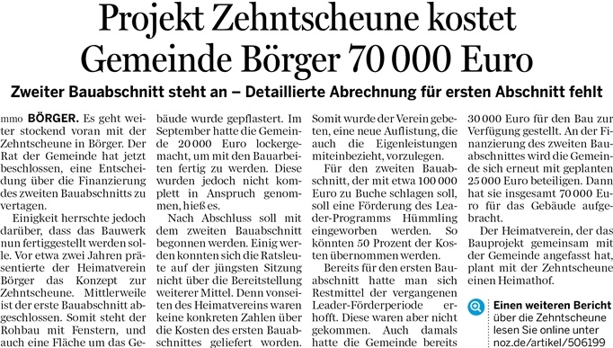 Bei einer Zusammenkunft mit den Verantwortlichen des LEADER-Projektes Mitte Januar 2016 im Heimathaus Börger, zu dem auch die Mitglieder der Fraktionen des Rates eingeladen waren, war nur der Bürgermeister Herm. Wöste und Hubert Jansen vom Gemeindebüro vor Ort. Das war schade, den hier hätten sich die Ratsmitglieder informieren können. Mindestens ein Protokoll dieser Zusammenkunft liegt der Gemeindeverwaltung vor. Auch die Abrechnung des I. Bauabschnittes ist öffentlich klar und vom Bauamt der Samtgemeinde geprüft und bestätigt. Da der HV Bauherr des 1. BA war und die Abrechnung und Prüfung durch die SG erfolgte, war der Rat der Gemeinde außen vor. In Auszügen ist der Sachverhalt auf dem Jahresempfang des HV am 10.01.15 öffentlich gemacht worden, an dem 8 Ratsmitglieder teilgenommen haben.
