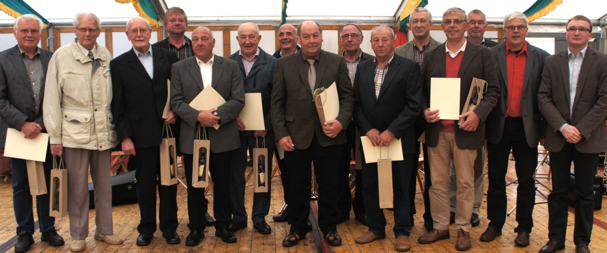 Zuvor waren die Motivwagen des Festumzuges geehrt worden. Hier errang die Gruppe „Wikinger“ mit dem Motiv „Framde Lüe habb us n Hus upstellt“ (Bau der Zehntscheune des Heimatverein – Bild oben rechts) den 1. Platz, gefolgt von Erstkommunionkindern mit ihrem Motivwagen „Kelch“ und der Gruppe „Sandhöge“. Im Anschluß der Ehrung wurden die ältesten anwesenden Gemeindemitglieder geehrt. Die Senioren Margaretha Runkel und Albert Wöste erhielten ein Präsent. (Fotos: LUB)