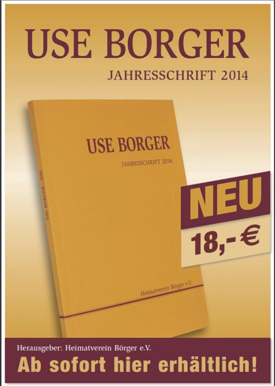 In der Ausgabe 2014 werden wir uns im Hauptteil um die Geschehnisse in Börger vor 100 Jahren kümmern. Damals, 1914 rutschte Deutschland und auch unsere Heimat in einen Krieg hinein, der brutal und menschenverachtend wird und der tiefe Lücken in der Gesellschaft hinterlässt. Liebe Leser, wer noch Informationen aus Börger, aus der Zeit von 1900 bis in die 1920er Jahre zur Verfügung hat, melde sich bitte bei uns. Denn auch in unserer Ausgabe 2015 wollen wir auch noch über diese Zeit berichten und nur die Mithilfe Vieler, bringt ein gutes Bild aus dieser Zeit.