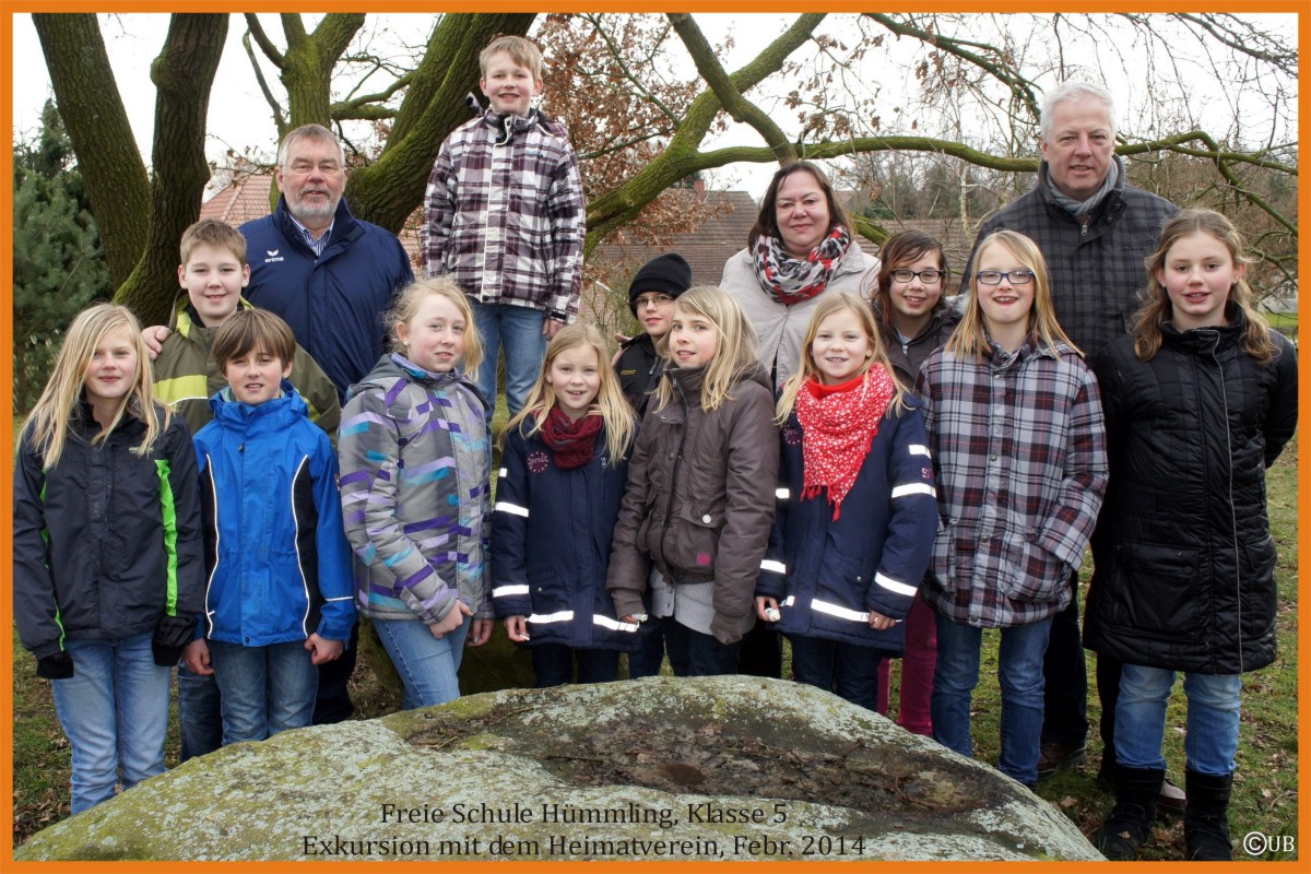 Wer rollte die großen Steine duch Börger? 18.02.2014 UB – Wer rollte die großen Steine durch Börger? – Das fragt der Heimatverein Börger jedes Jahr die Schüler der Klasse 5 der Freien Realschule Hümmling in Börger. Auch in diesem Jahr ging es wieder im Rahmen des Geschichtsunterrichtes zu den Steindenkmalen in unserem Ort. Die Lehrer Barbara Harden und Bernhard Blanke sowie Hermann Schmitz und Hermann Ubbenjans vom Heimatverein waren zu den Zeugen der vorchristlichen Kultur in Börger unterwegs. Es war schöne Unterrichtsstunden sagten die Kinder. Wer Informationen über die „Großen Steine“ haben möchte kann diese unter folgendem  Link, bekommen.