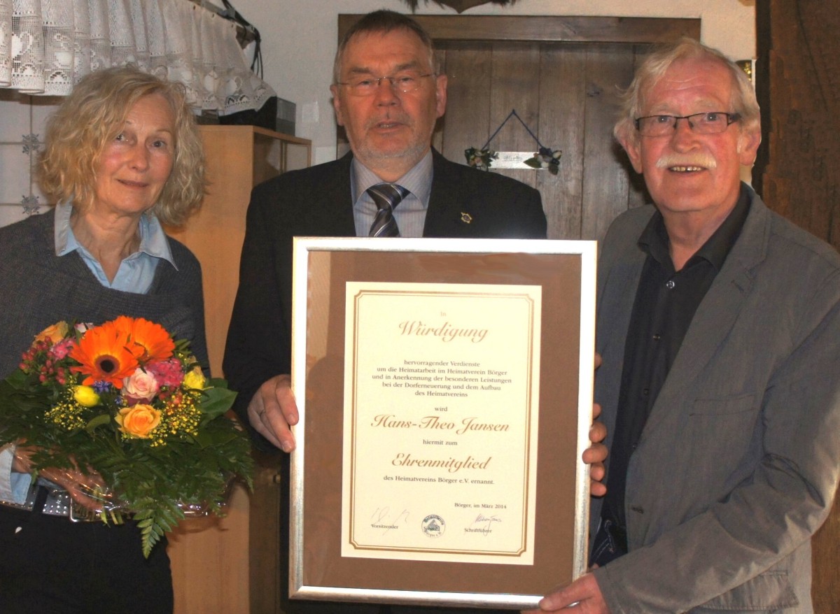 24.03.2014 UB – Ein besondere Ehre wurde dem ehemaligen Vorsitzenden Hans Theo Jansen zuteil. Er wurde Ehrenmitglied des Heimatverein Börger. Hans Theo hat sich jahrzehnte lang für den Heimatverein eingesetzt und war vor Gründung des Heimatvereins als Bürgermeister von Börger maßgeblich an der Erstellung des Heimathauses beteiligt und bei der Gründung des Verein im Jahre 1987 bei vielen Maßnahmen zum Aufbau des Vereins behilflich. Dazu gehört die Arbeit bei der Aktion „Dorferneuerung“ in dieser Zeit, aus deren Mitglieder der Heimatverein entstanden ist. Als im Jahre 2004 die Feiern zum Dorfjubiläum „1150 Jahre Börger“ anstanden und der Vorsitz des Vereins krankheitsbedingt neu geregelt werden musste übernahm er für einige Jahre den Vorsitz des Heimatverein Börger e.V.. In dieser Zeit übernahm der HV maßgeblich die Ausrichtung der Feierlichkeiten 1150 Jahre Börger in den Jahren 2004 und 2005, unter der Führung von Hans Theo Jansen. Hierfür dankt der Heimatverein mit der Ehrenmitgliedschaft. Hermann Schmitz (mitte) überreichte auf der Jahresmitgliederversammlung im März 2014 die Urkunde an H.T. Jansen (re). Ehefrau Annemarie (li. auf dem Bild) erhielt für die langjährige Unterstützung ihres Ehemannes ein schönes Blumengebinde.
