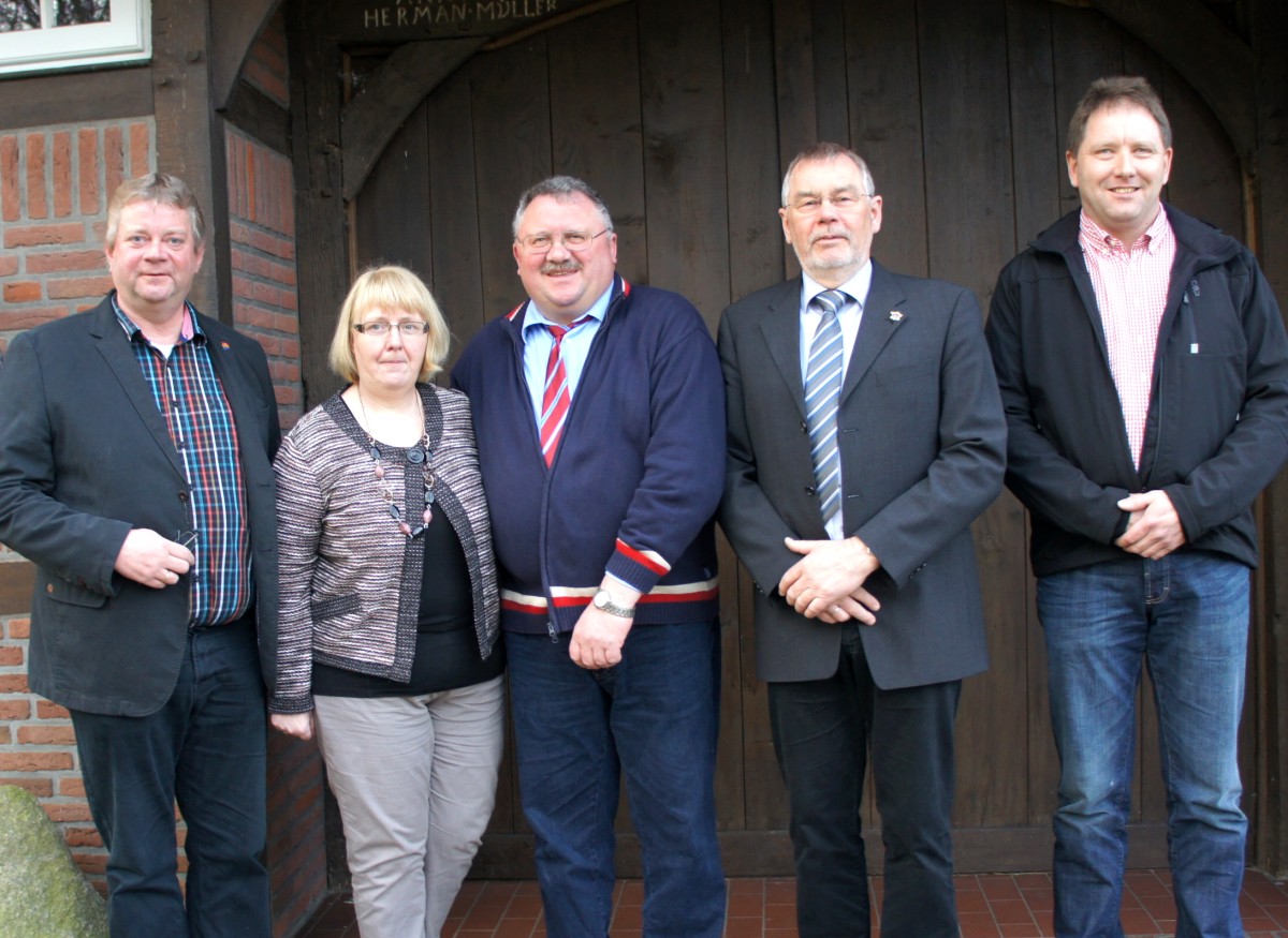 Der Vorstand des HV Börger (v. li.) Schriftführer Herm. Ubbenjans, Stellv. Kassenführerin Theresia Oldiges, Kassenführer Heinz Oldiges, 1. Vorsitzender Herm. Schmitz u. 2. Vorsitzender Gerd Többen. Foto: Anna Kröger 24.03.2014 UB – Mit reger Beteiligung fand gesternnachmittag die Mitgliederversammlung des Heimatverein Börger statt. In einem Jahresrückblick erläuterte Vorsitzender Hermann Schmitz die Aktivitäten im abgelaufenen Jahr. Höhepunkte waren das 25jährige Bestehen der Tanzgruppe und der Beginn der Planungen für ein Sammlungs- und Archivgebäude, der so genannten „Zehntscheune“. Anschließend wurde ein Teil des Vorstandes (jedes Jahr ist die Hälfte des engeren Vorstandes neu zu bestimmen) gewählt. Im Vorfeld dieser Wahl hatte Josef Schmees erklärt, das er nach 27 Jahren Vorstandsarbeit für eine weitere Periode nicht zur Verfügung steht. Für ihn wurde im Vorfeld der JHV Gerd Többen vorgeschlagen. Bei der Wahl gestern wurde Gerd Többen einstimmig zum Stellvertretenden Vorsitzenden gewählt und Hermann Ubbenjans einstimmig als Schriftführer wiedergewählt. Zu diesem Wahltag sollte auch der Vorstand um Beisitzer erweitert werden. Geplant war für den Kassenwart, Schriftwart und für den Vorsitz (zweiter Stellvertreter) eine Beisitzerin (oder Beisitzer) zu benennen. Dieses gelang aber nur zum Teil. Zum stellvertretenden Kassenführerin wurde Theresia Többen (einstimmig) gewählt. Die Stellvertreter von Schriftführer und im Vorsitz des Vereins sind noch vakant. Hier muß im nächsten Jahr (möglichst mit Frauen) nachbesetzt werden. Aussichtsreiche Kandidatinnen gibt es!