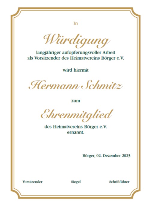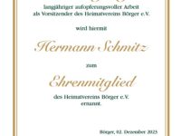Heinz Oldiges (li.) und Johanna Terhalle (re.) ernannten Hermann Schmitz zum Ehrenmitglied des HV Börger – Foto: UB 02.12.2023 UB – Hermann Schmitz ist heute als langjähriger Vorsitzender des HV Börger, auf Beschluss des Vorstandes im Sept. 2023, zum Ehrenmitglied des Heimatverein Börger e.V. ernannt worden.