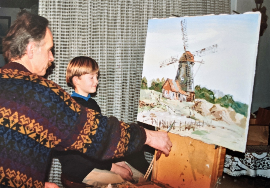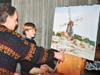 Arvidas am Arbeiten. Sebastian Schmitz schaut interessiert zu! 11.06.2023 UB – Seit heute befindet sich im Erdgeschoß der Zehntscheune eine Sammlung von Bildern der Börger Künstlerin Heike Fleer. Sie malt seit ihrer frühesten Jugend. Die Künstlerin ist heute in der Zehntscheune anwesend und lässt sich über die Schulter schauen. Sie antwortet auf Fragen von interessierten Besuchern.